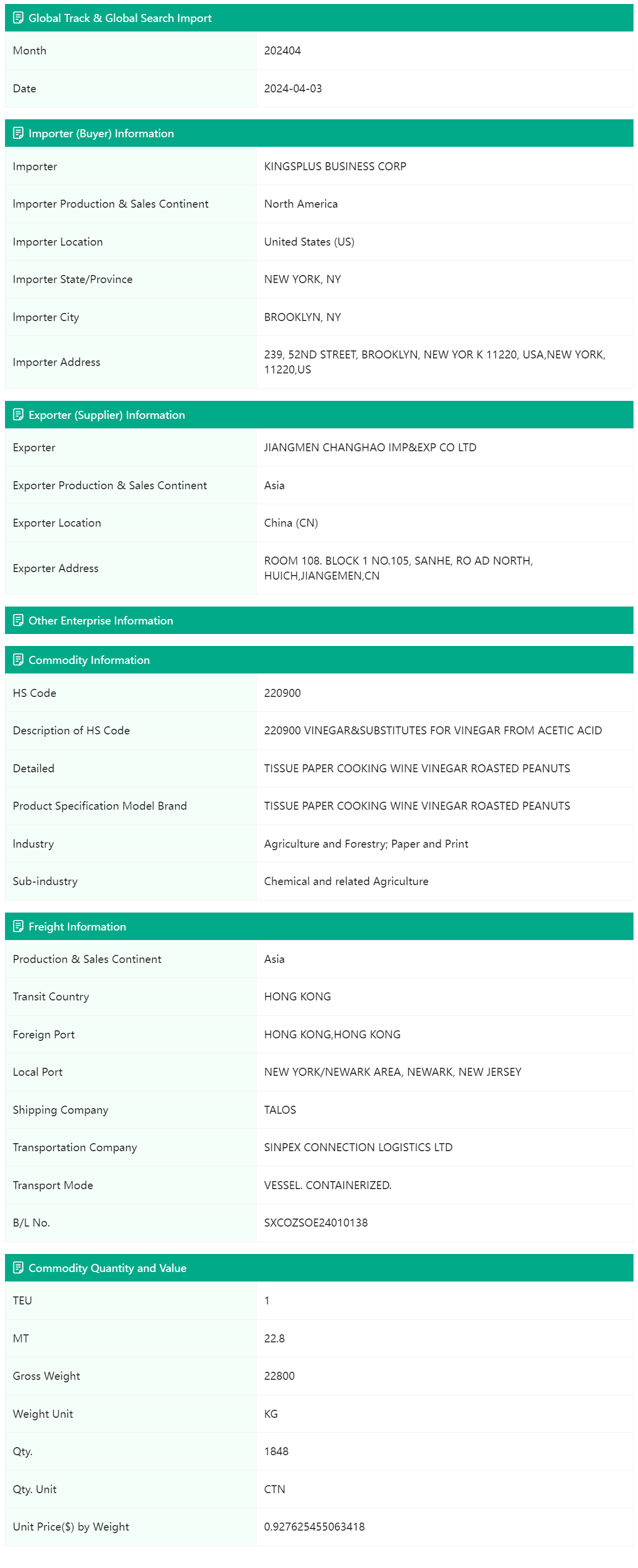 Global Track & Global Search Trade Data currently has customs data for more than 80 countries, including complete customs information on trade activities in each country. The content covers buyer name, supplier name, HS code and detailed description, product name and specification model, amount, price, quantity, dozens of field information such as country of origin and destination, date, port of departure, port of destination, carrier, bill of lading number, etc. In addition, we have various big data application analyzes in more than 200 countries or regions around the world, providing buyers and suppliers with company names, addresses, person-in-charge phone numbers, emails, decision-makers, company operations, website addresses and other information.
